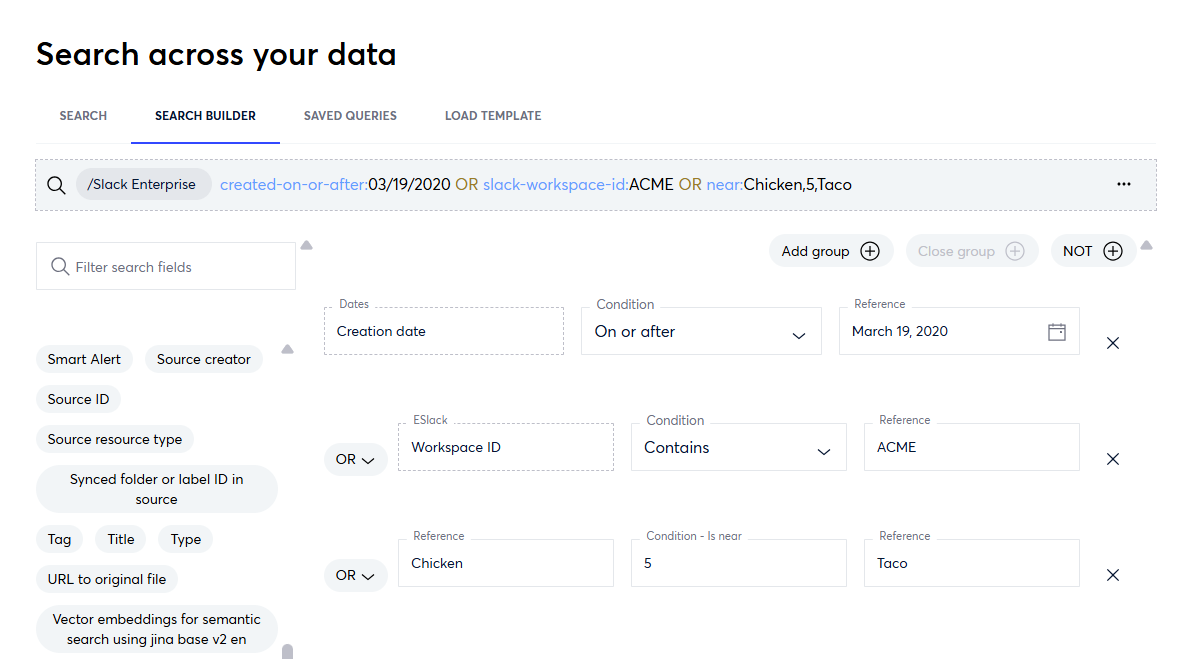 Slack data can be searched based on keywords, proximity searches, senders, file types, modification dates, and other metadata.