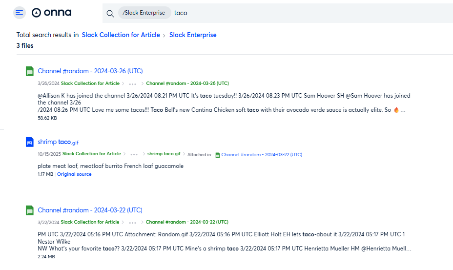 Onna solves the challenges of collecting Slack data. Onna connects to Slack accounts allowing all employee accounts to be available for legal hold. When necessary, organizations can select the accounts needed to be placed on hold and create a steadily syncing archive. Even if users delete or modify files in the source systems, Onna keeps an original defensible copy.