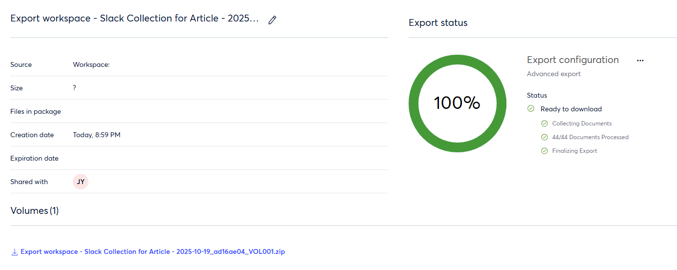 After Slack data is searched to identify records for review, Slack data can be selected for export for document review.